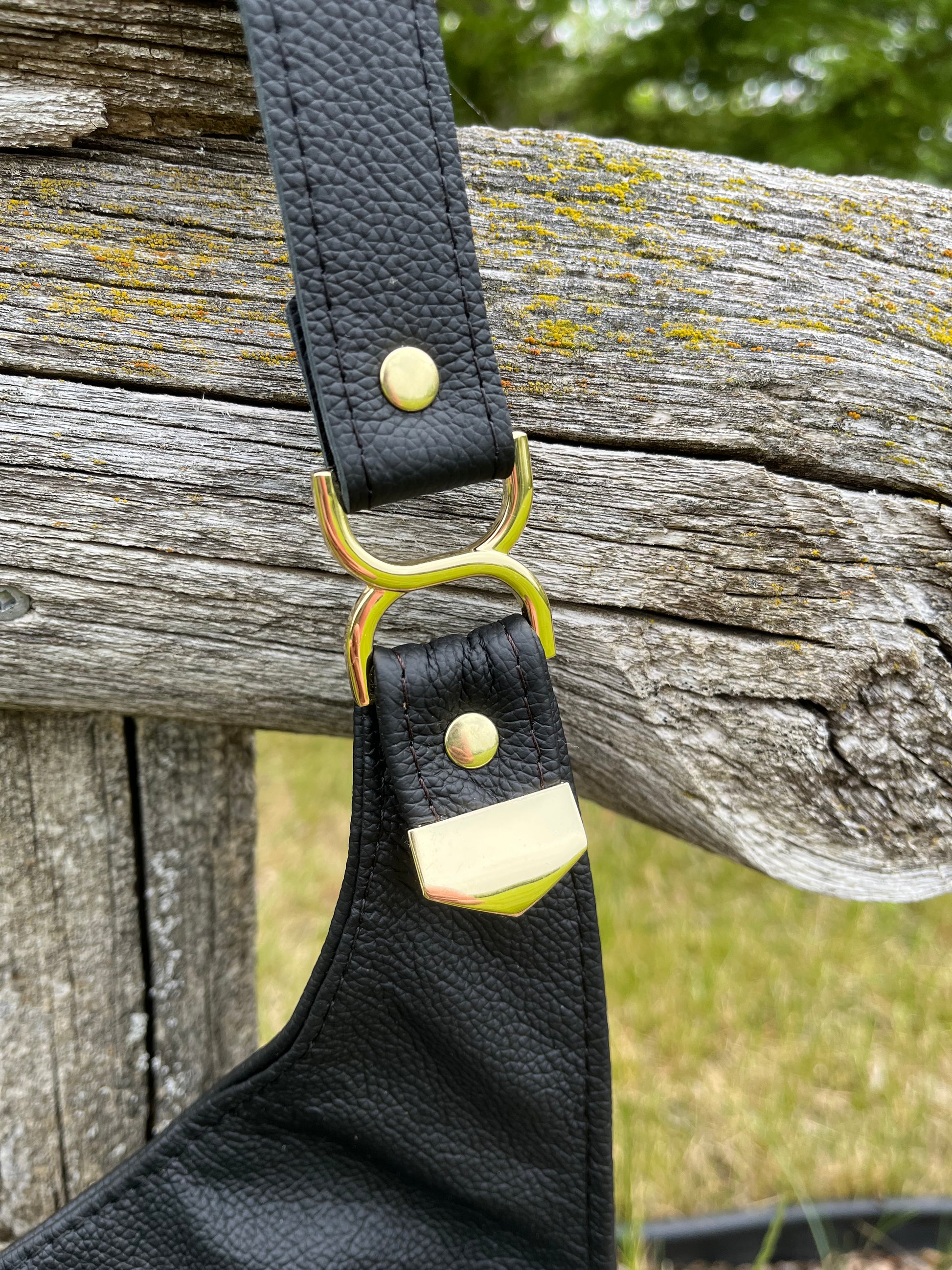 Black leather, long fringe, gold hardware and bold wool.  Classy, gorgeous accessory!