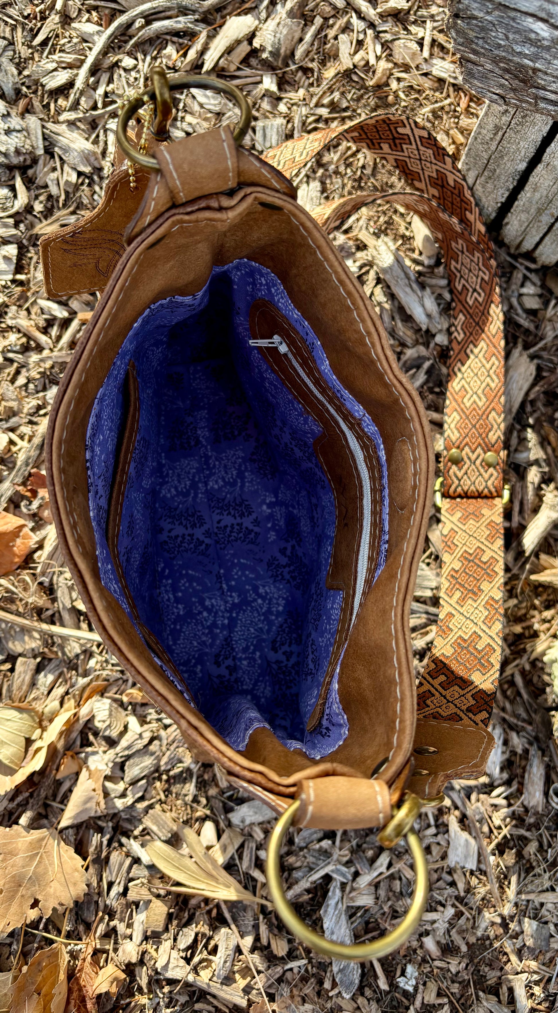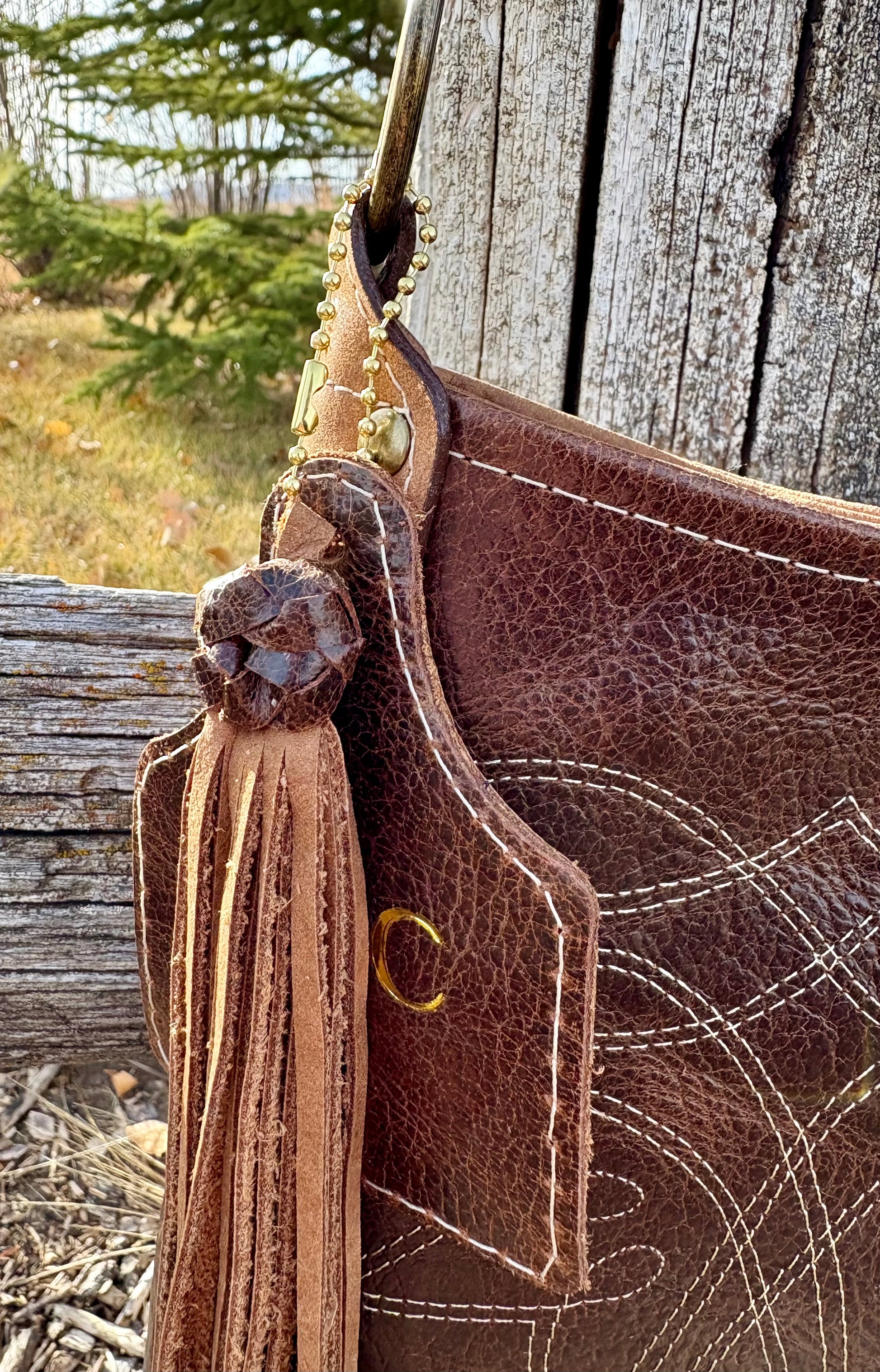 Gorgeous booth stitching was embroidered onto this stunning deep brown leather to create this one of a kind purse.  The embroidery thread is a perfect match to the tan accent leather.  Antique brass hardware and metal zippers for a high end classy look.   Inside there is a leather overlay zipper pocket and a dual slip pocket.  The back has another zipper pocket.  Slider adjustable crossbody strap. Measures 10.5Wx9.5Hx3D.