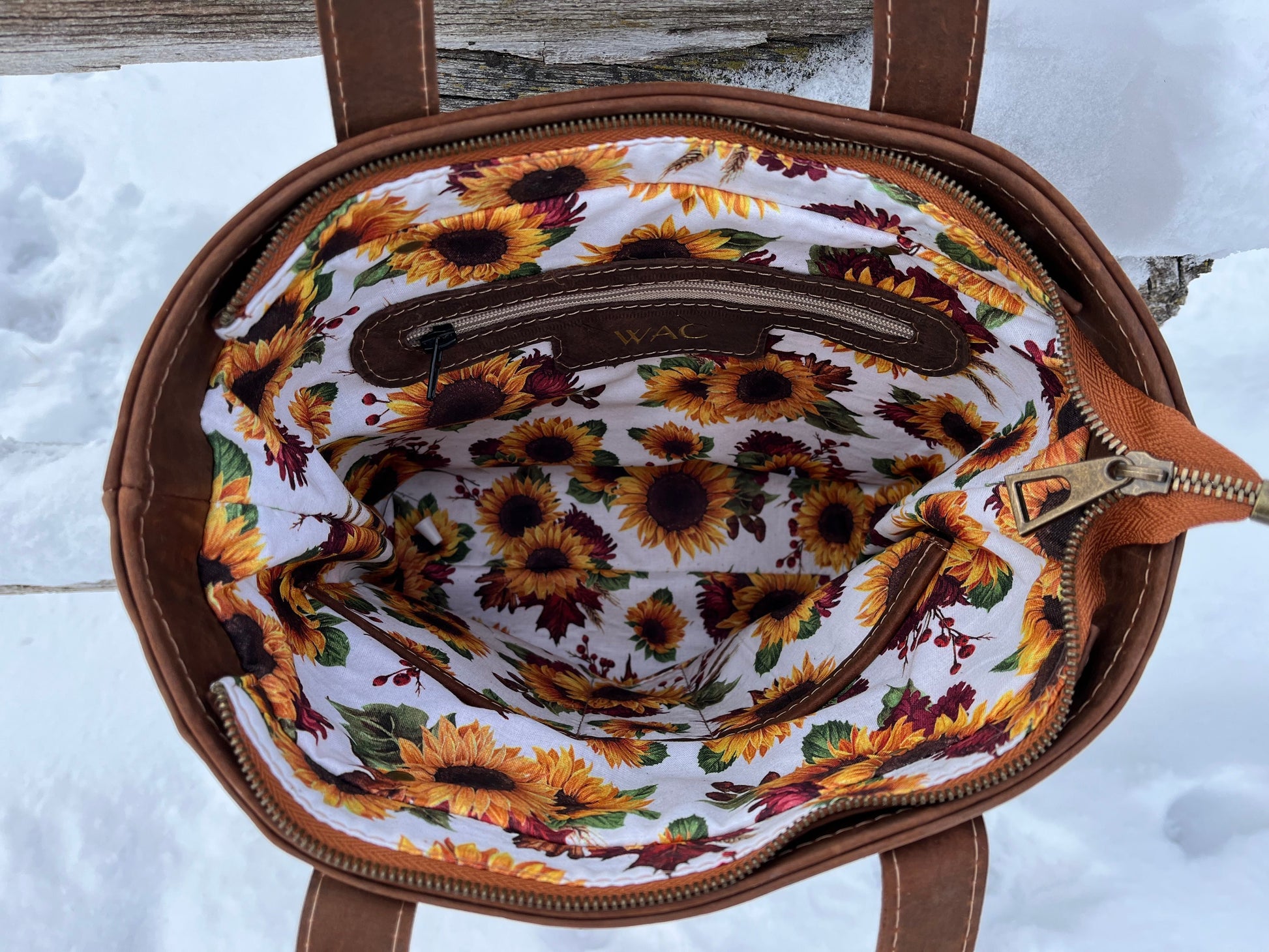 Brown distressed leather tote paired with a bold and beautiful genuine Pendelton wool front pocket.  Dual front pocket large enough for your phone or keys.  High end antique brass metal zipper and antique brass hardware.  Inside a bold sunflower cotton lining.  There is a leather overlay zippered pocket and a leather topped dual slip pocket with a pen pocket. The base has 4 antique brass purse feet to keep the leather base clean.  Reinforced straps and base will allow you to fill this tote with the essentials. Tote measures 11W x 12H x 4D