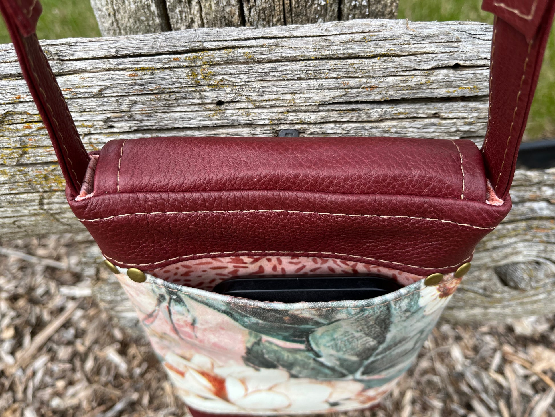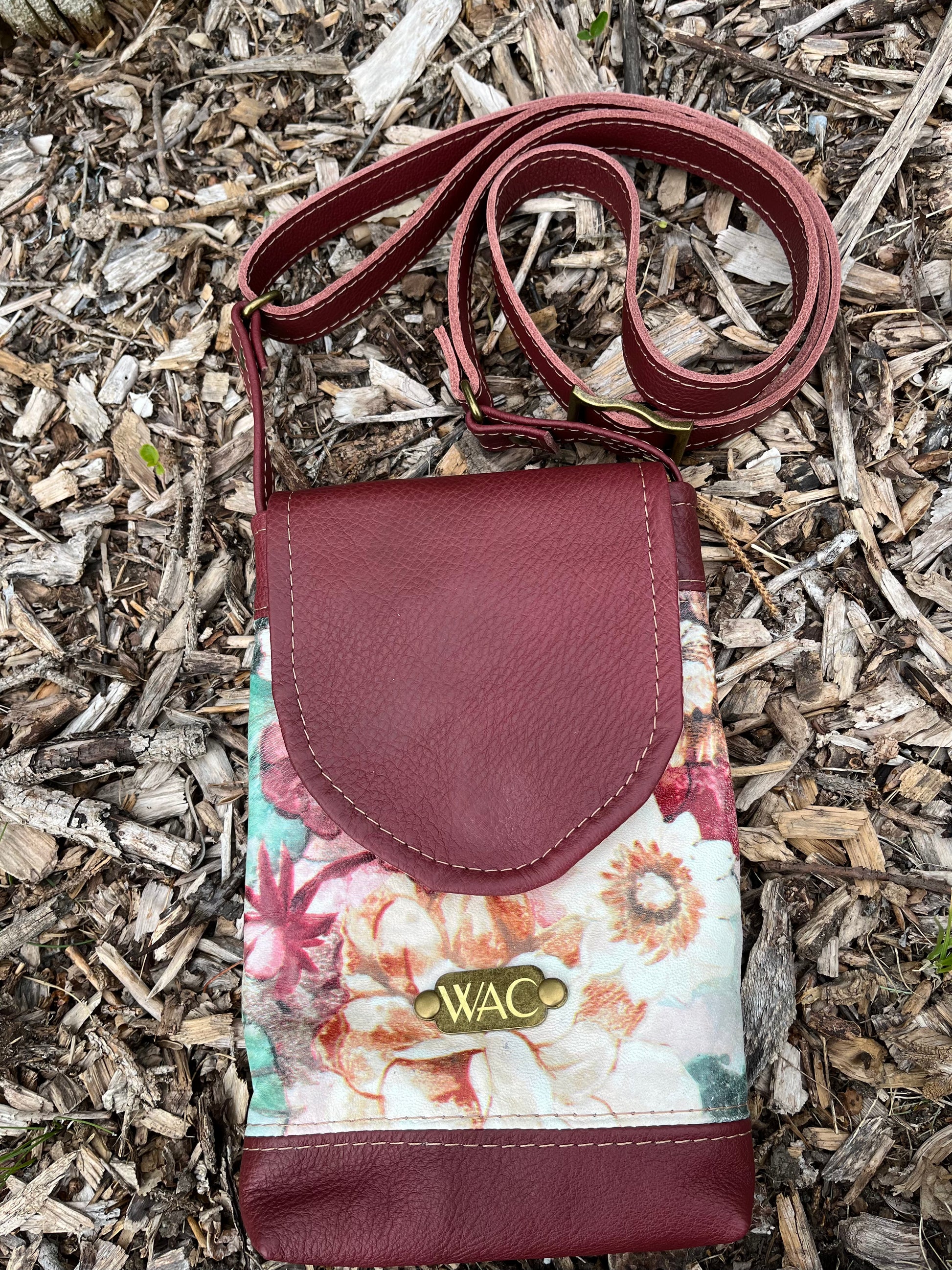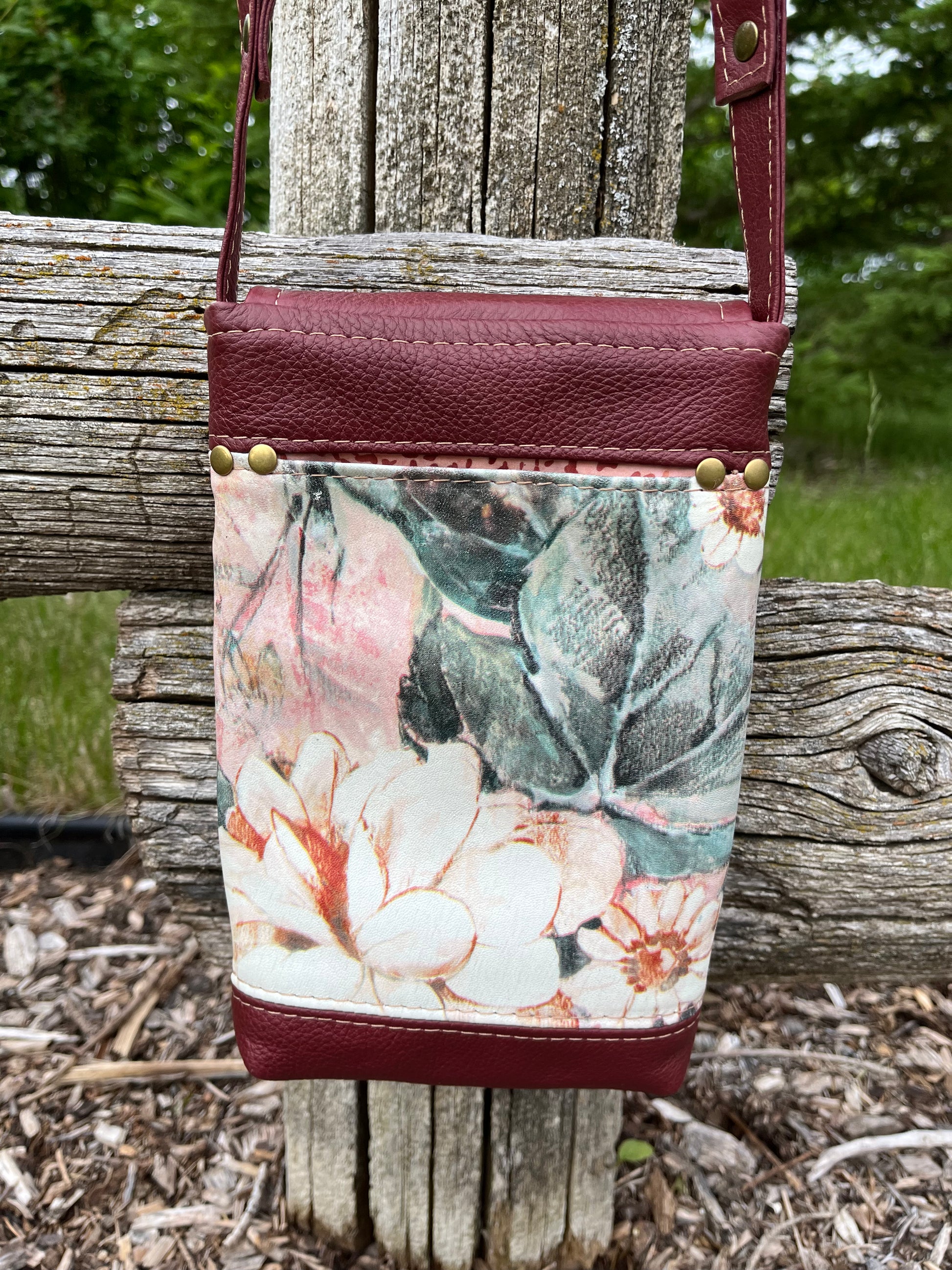 I paired burgundy leather with this stunning floral leather for a super fun, summer chic look. This buckle adjustable crossbody purse is the perfect summer accessory. Antique brass hardware to keep the focus on the gorgeous leathers.  It has a keep pocket on the front, a phone pocket on the back and an ID and credit card slot in the interior. It measures 5.5”W x 8.5”H x 1.5”D.
