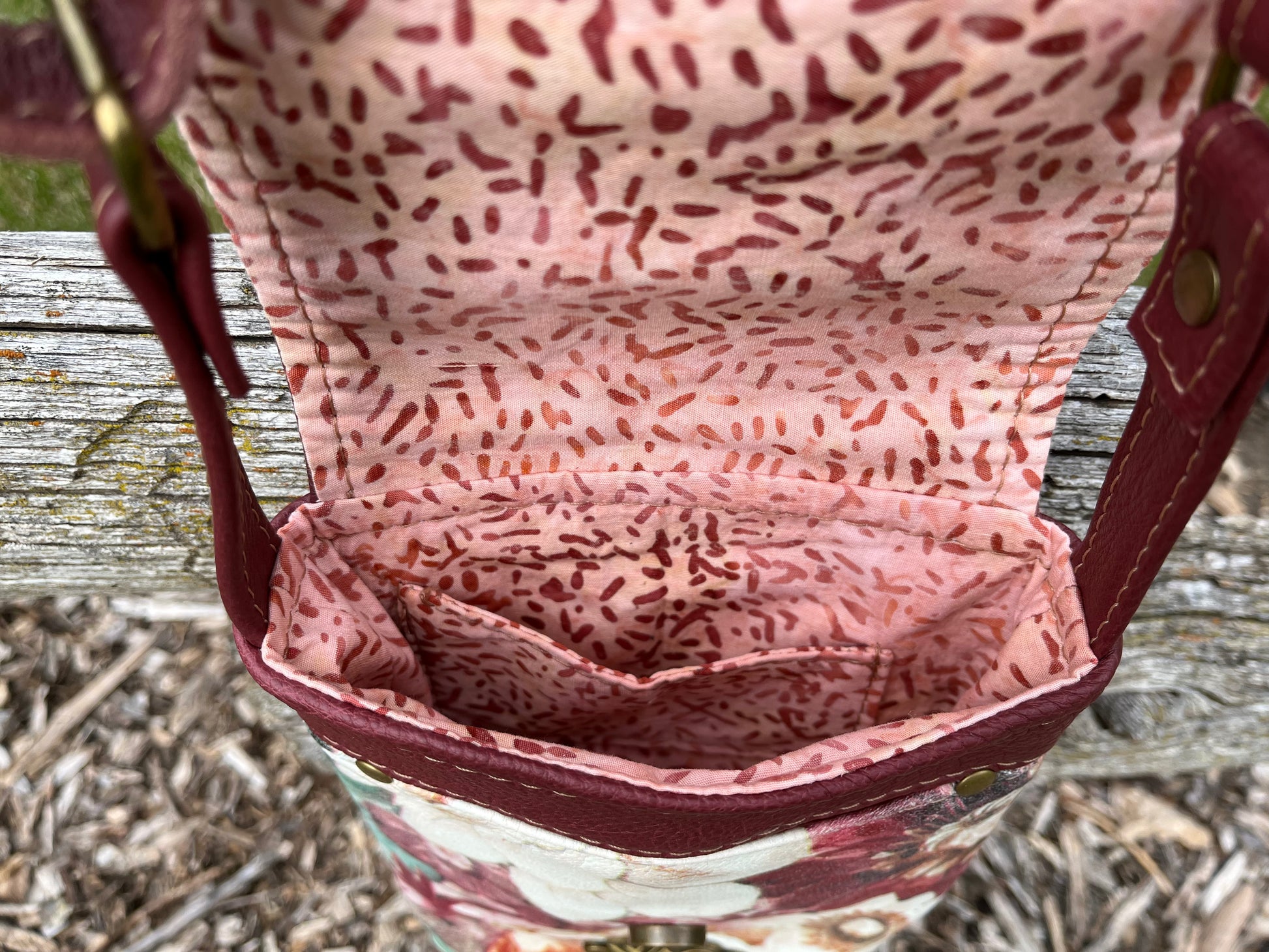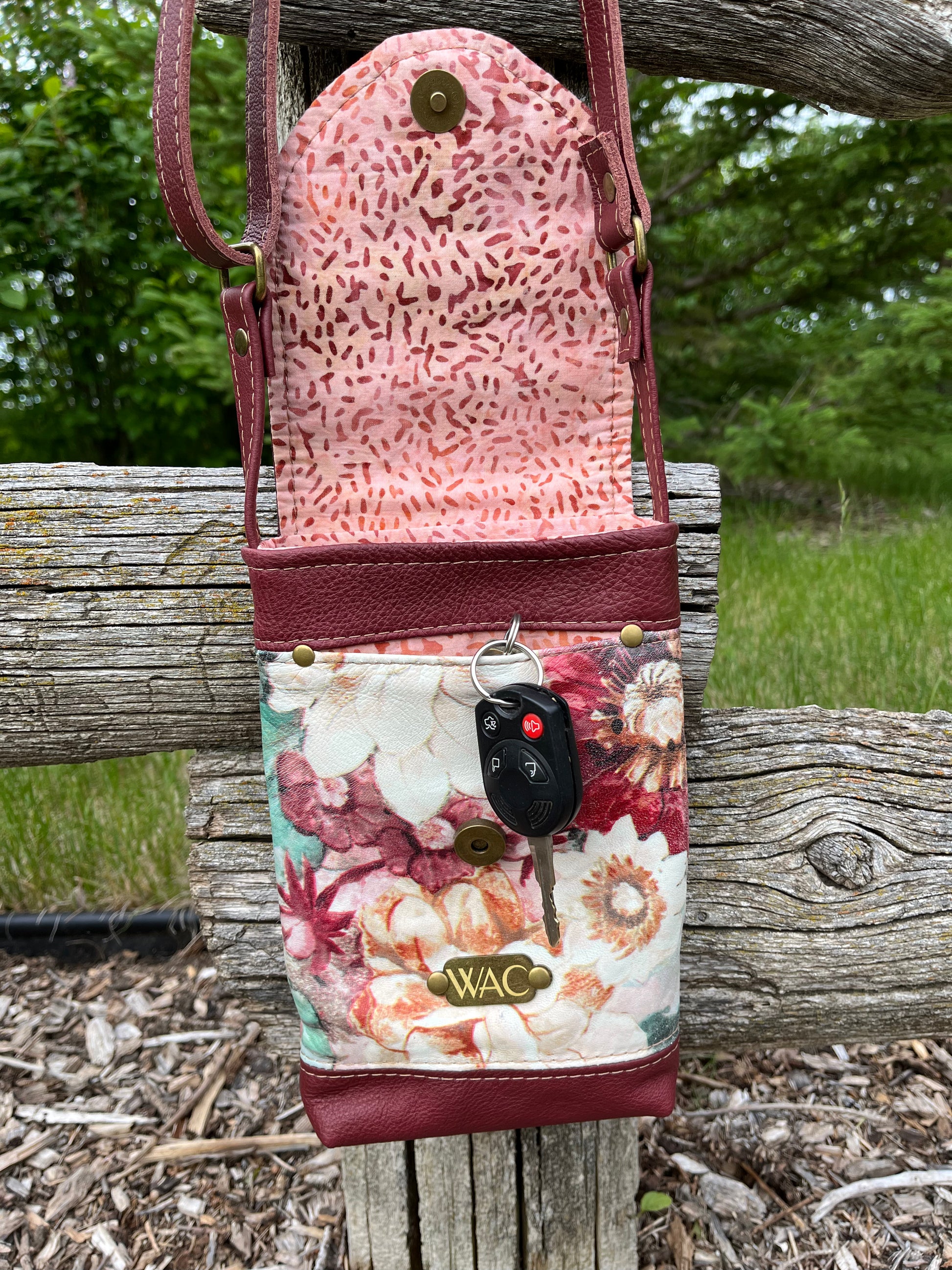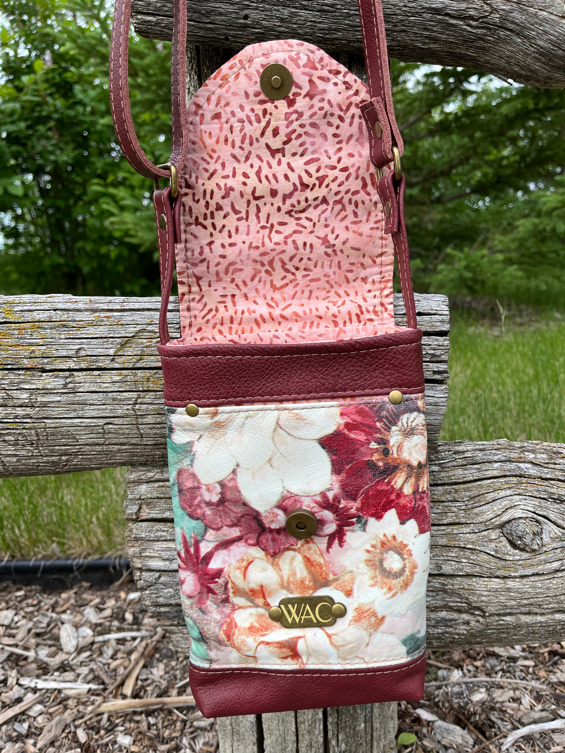 I paired burgundy leather with this stunning floral leather for a super fun, summer chic look. This buckle adjustable crossbody purse is the perfect summer accessory. Antique brass hardware to keep the focus on the gorgeous leathers.  It has a keep pocket on the front, a phone pocket on the back and an ID and credit card slot in the interior. It measures 5.5”W x 8.5”H x 1.5”D.
