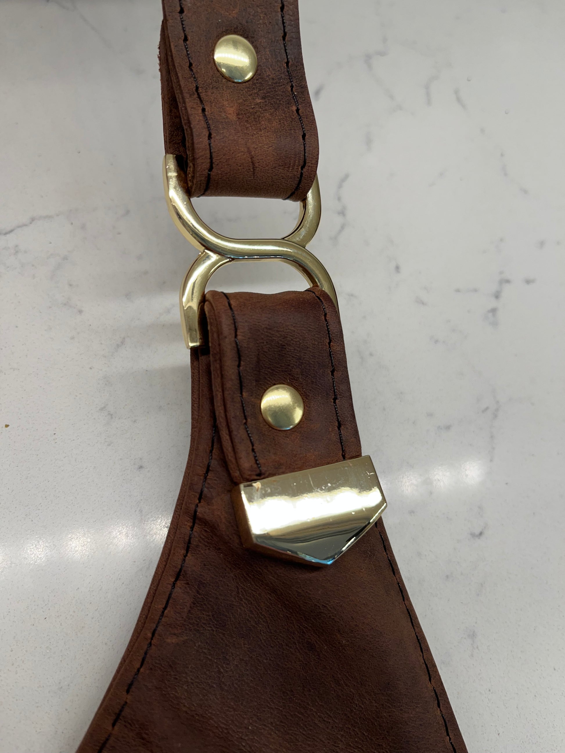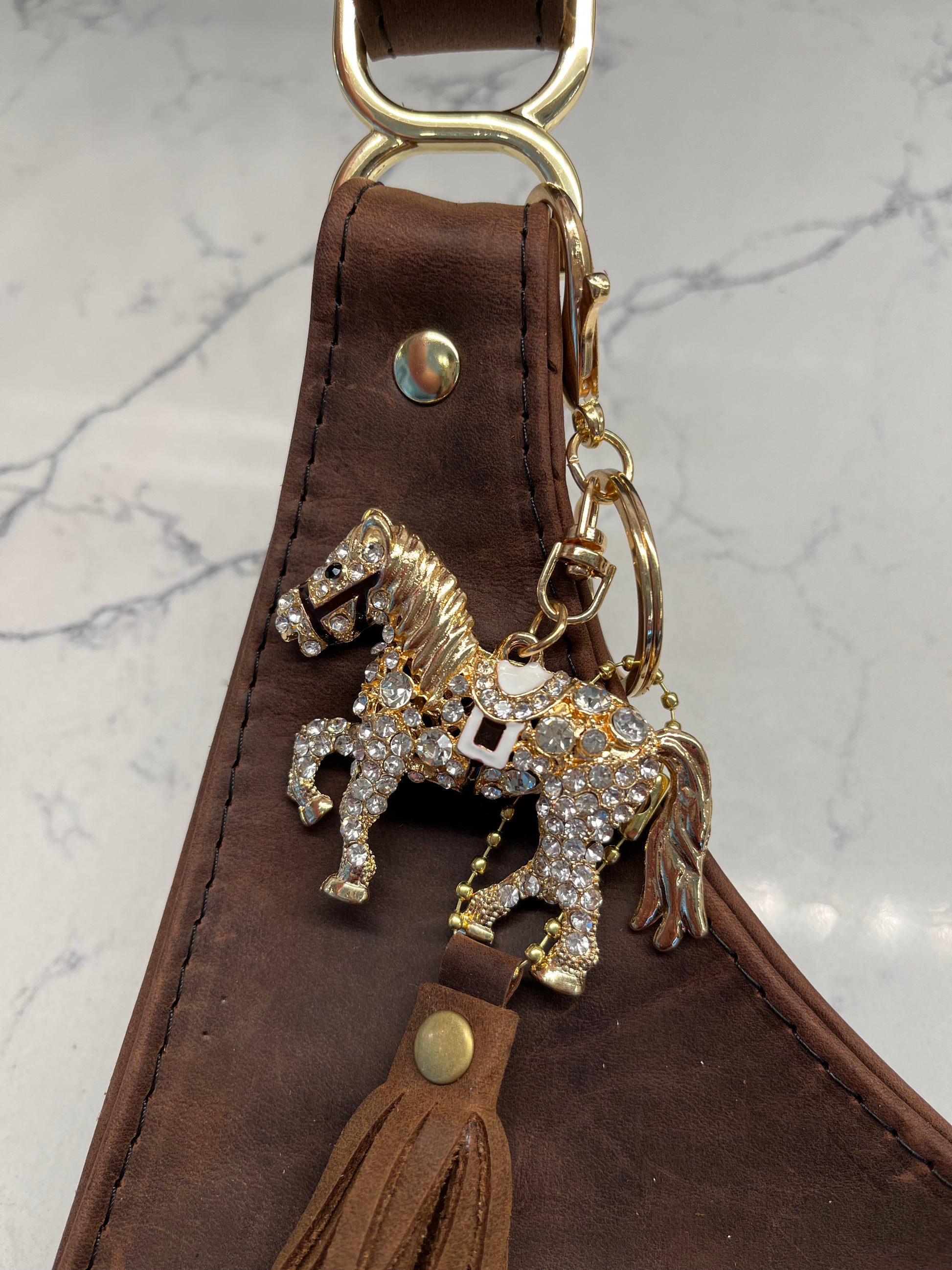 One of the nicest crossbody purses I've constructed in this style.  Stunning distressed brown leather paired with a cream toned wool/poly blend. Glossy, gold hardware shines on this purse.  Inside I chose a cotton fabric that compliments the exterior colors.   There is a leather overlay zippered pocket to keep items secure.  Magnetic snap keeps the purse closed.  Additional tassel and blingy horse accessory included.  Measures 14.234W x 11L.