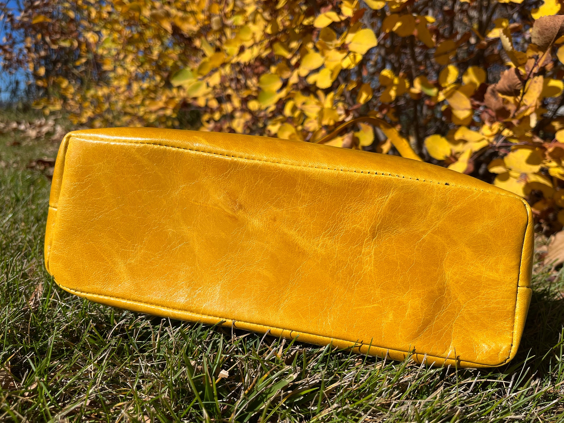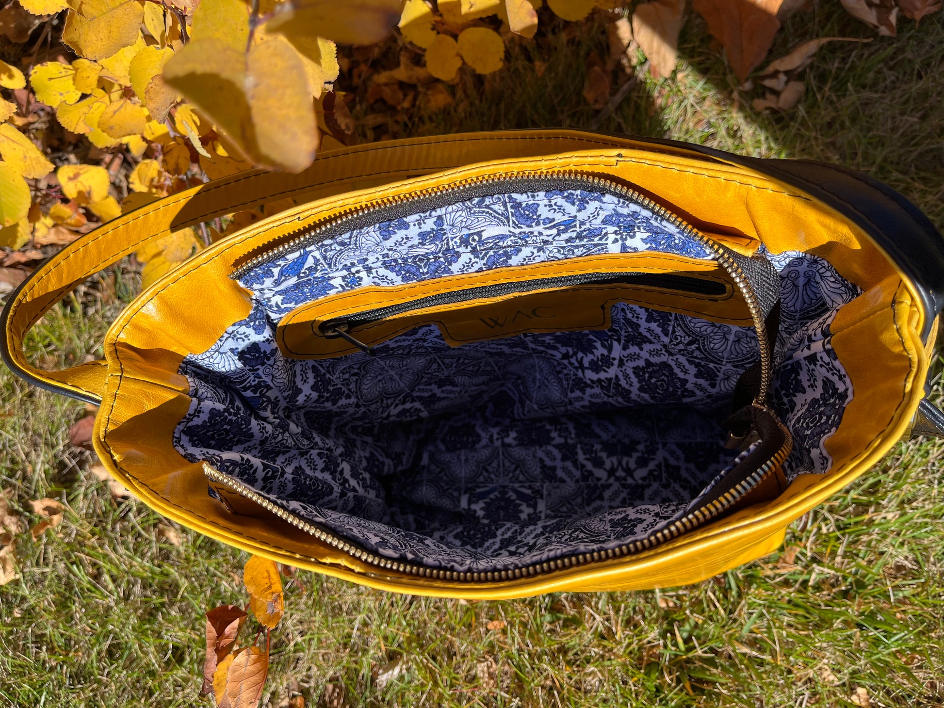 The perfect fall purse has arrived!  Soft and supple mustard and navy blue leathers make a perfect combination on this gorgeous purse. Gold hardware was the obvious compliment and the large magnetic flap closure makes such a beautiful statement on the front of this purse. Inside I used a bold navy blue cotton to compliment me outside colours. There is a leather overlay zippered pocket. Short shoulder strap allows this bag to sit perfectly under your arm. Custom orders are available.