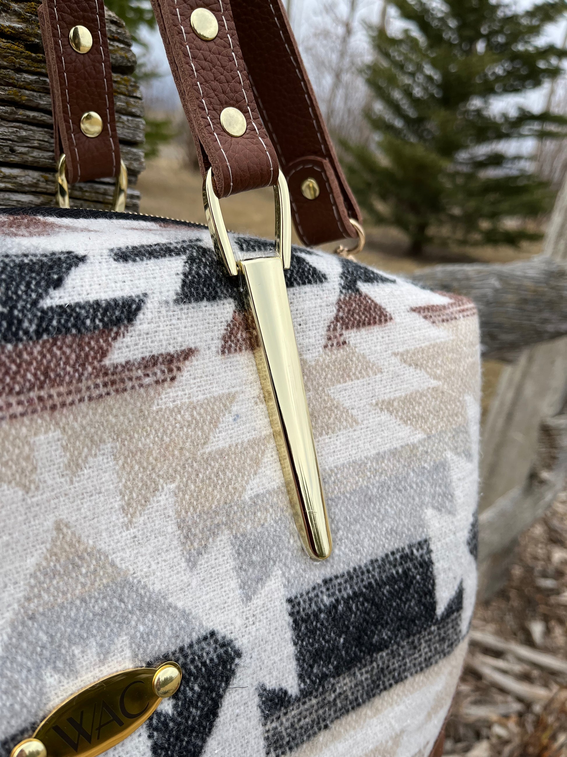 Beautiful cream toned wool/poly blend was the inspiration for this gorgeous travel bag.  These bags can be used as a carry on, an over night bag, a diaper bag or even just your everyday purse.  A beautiful pebbled brown leather paired perfectly with the wool.  High end, glossy gold long strap connectors and hardware as well as metal zippers.