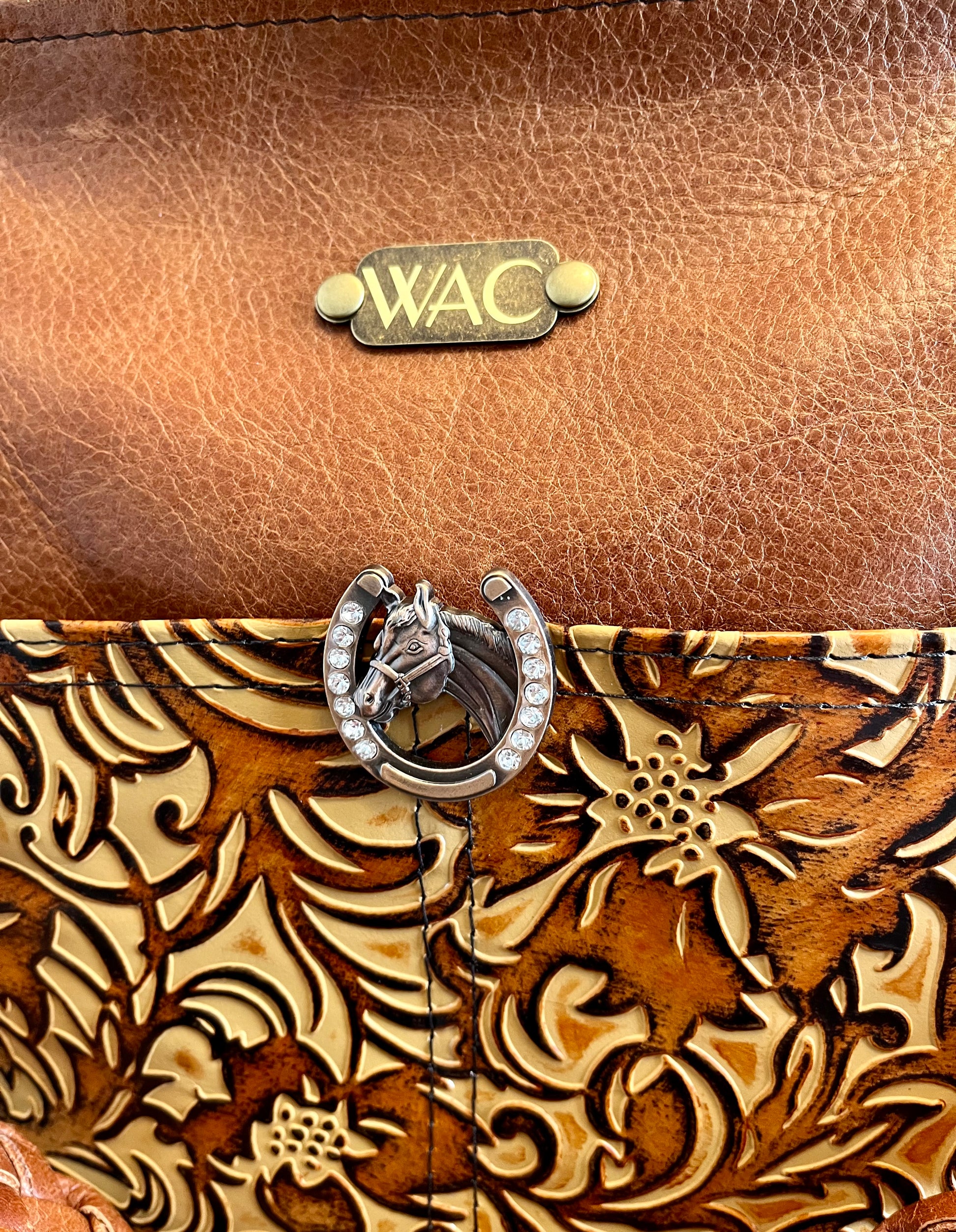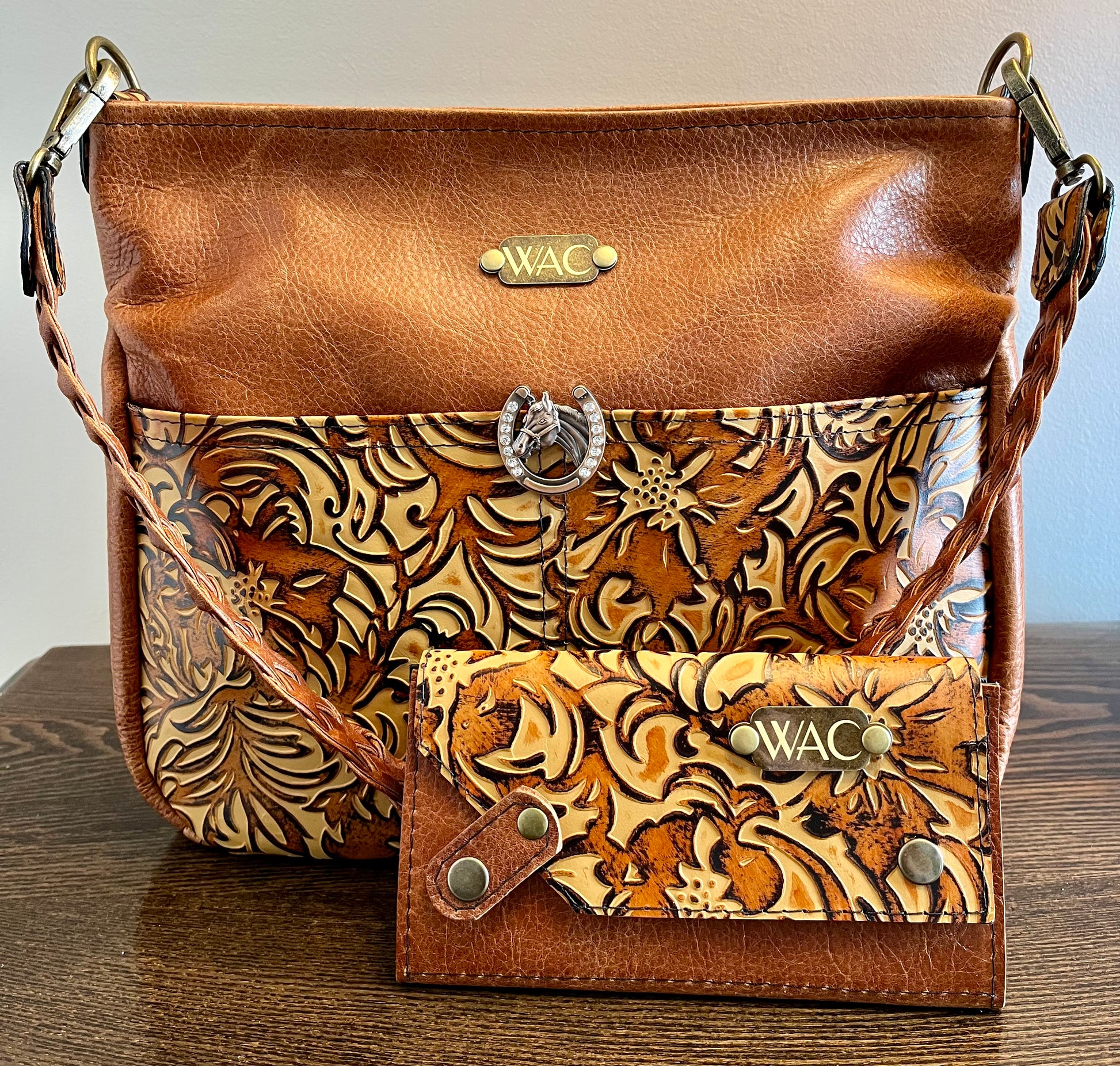 Buttery soft pumpkin/cognac toned leather is paired with a beautiful floral embossed leather to create this exceptional purse and matching wallet. The purse is a slouchy hobo style ad has a beautifully braided shoulder strap. Two exterior slip pockets that are separated with a pretty horse concho. There is an additional zipper pocket on the back. Inside there is another 2 slip pockets and an additional leather overlay zipper pocket. The wallet has a total of 7 card slots, a clear ID slot, money slot and zippered coin pocket. It closes with a high end matching antique brass frame. It measures 7½” W x 8¾” H. The purse measures 11½” W x 10” H x 3” D