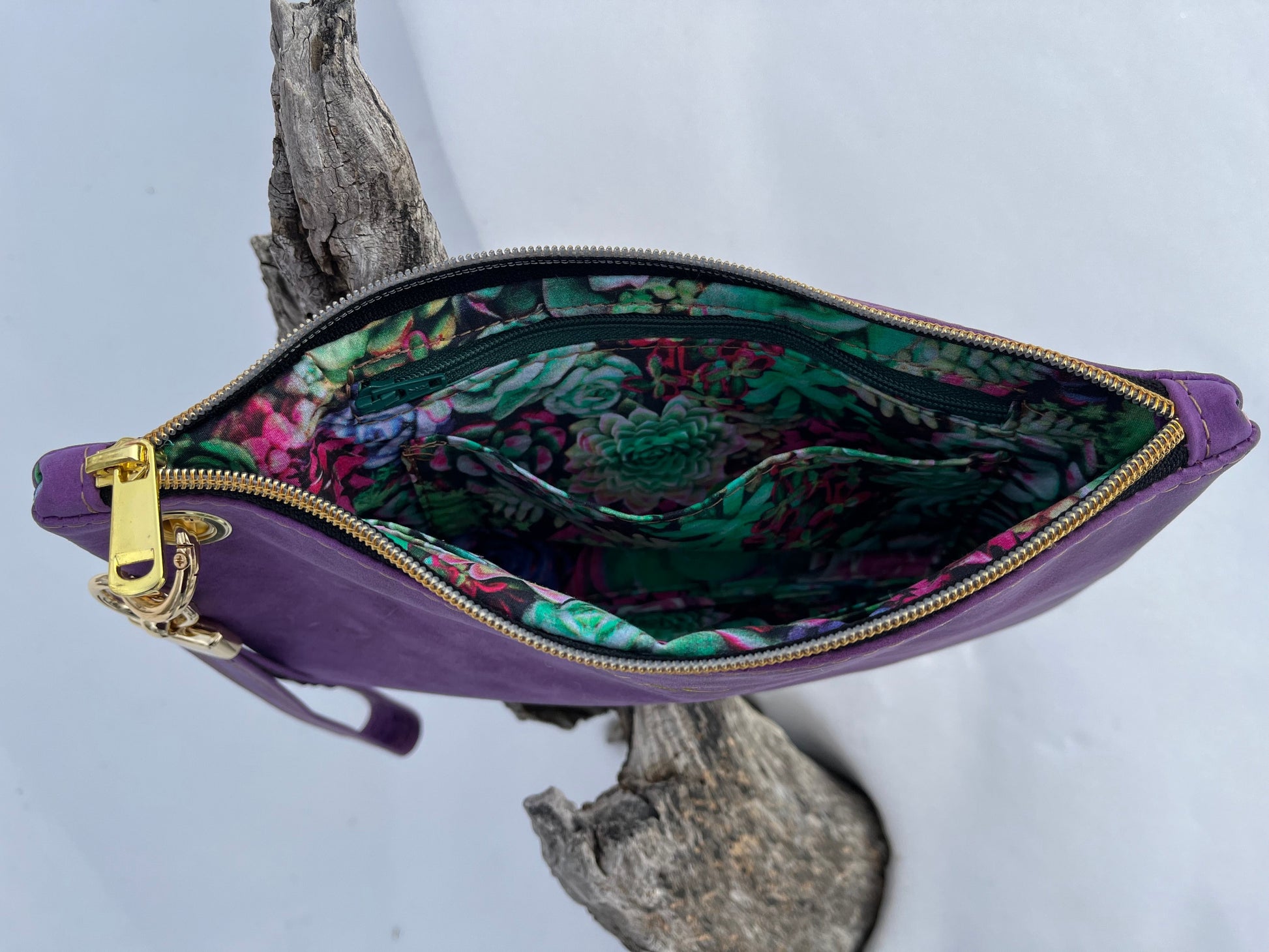 Purple leather wristlet with a detachable wristlet strap. Gold hardware and zippers. Inside a bold floral cotton.  Eight card slots on one side and a zippered pocket and slip pocket one the other. Small and compact option for those that don't want to carry a purse.  Measures 11W x 6H.