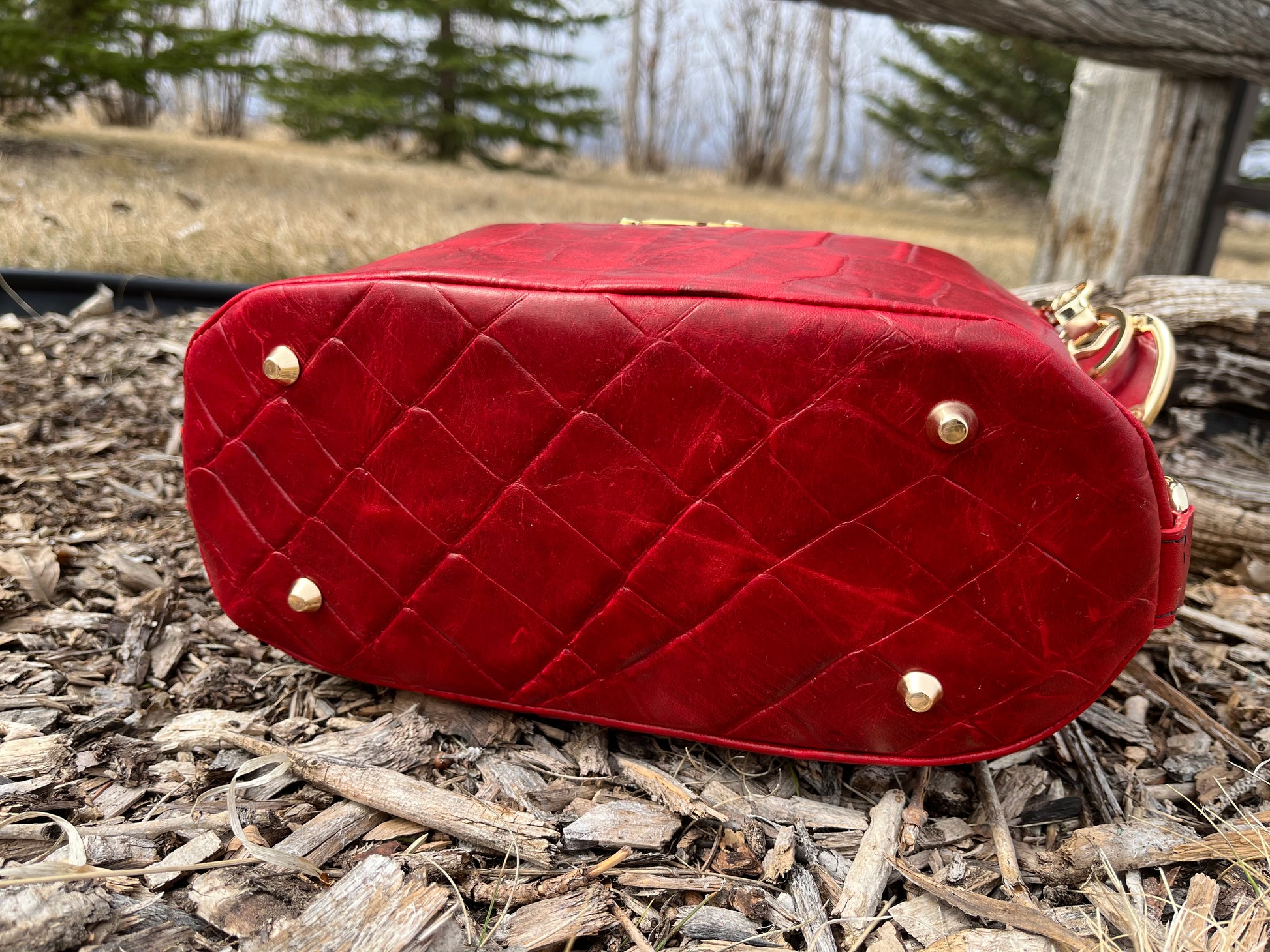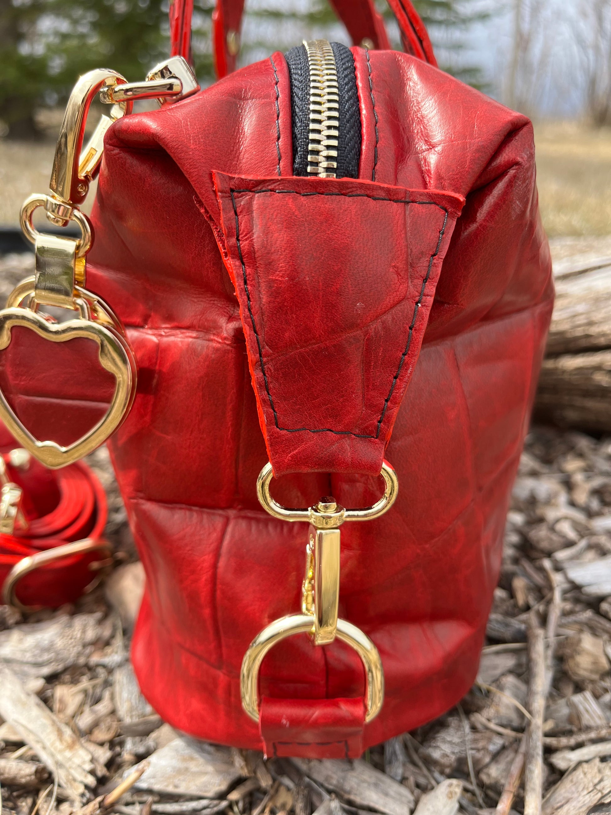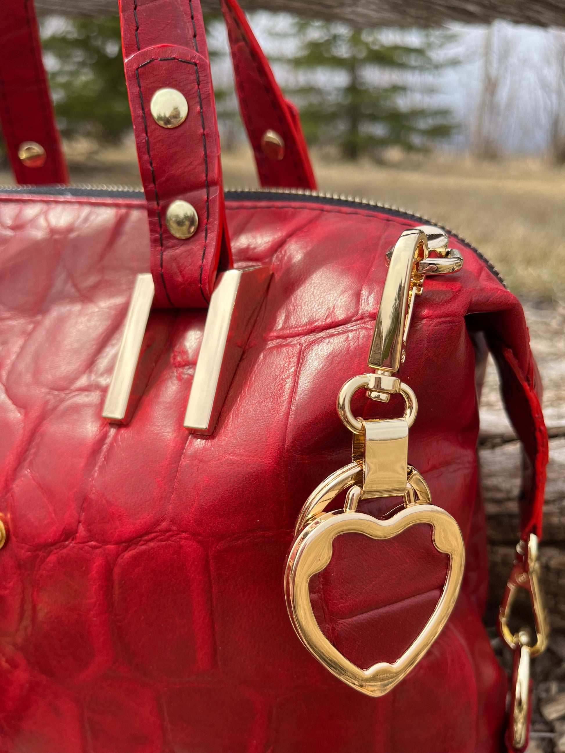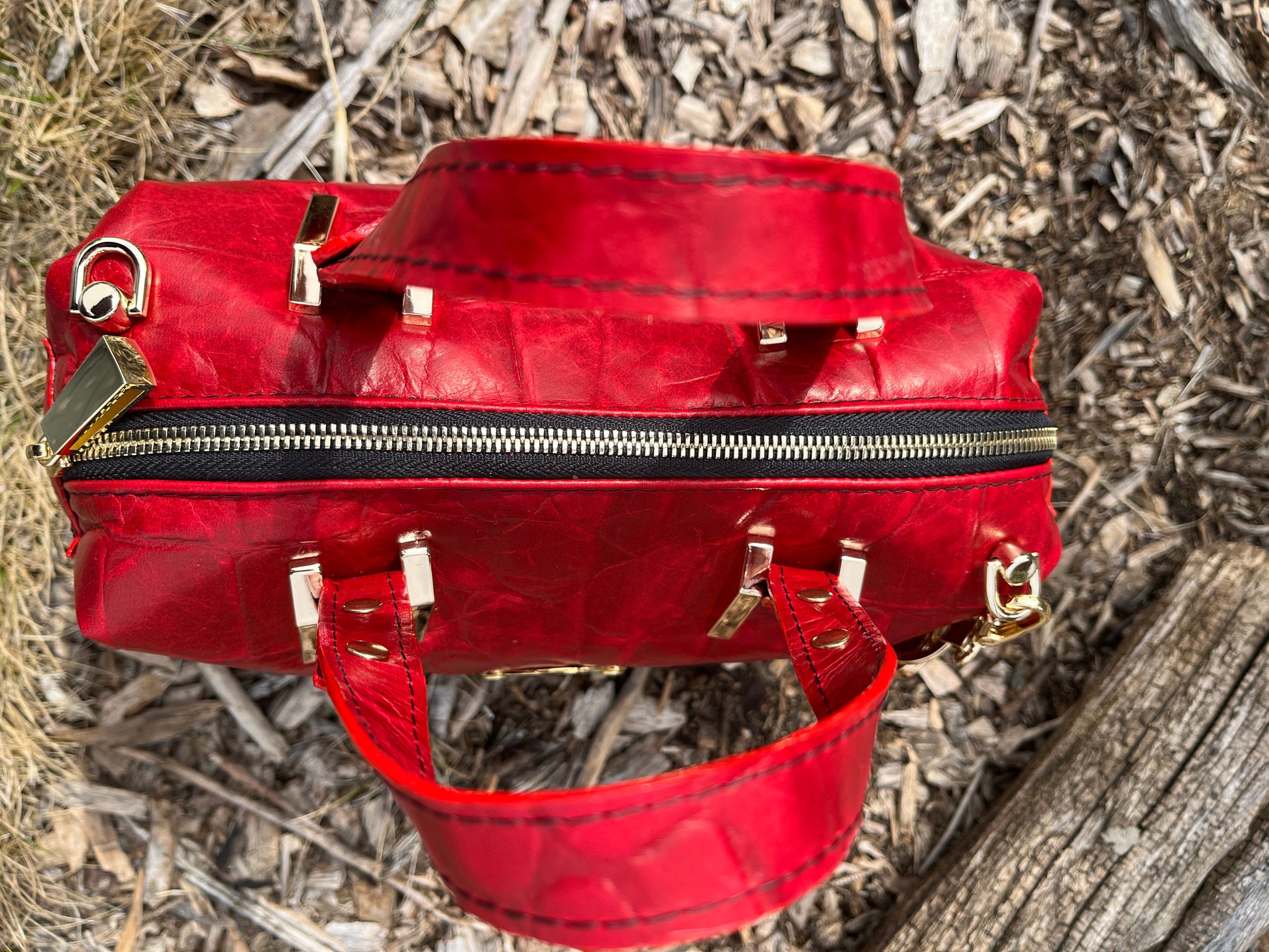 Gorgeous red Italian alligator embossed leather purse with high end, glossy gold hardware.  This exceptional purse will be a gorgeous accessory to any outfit and can be worn dressed up or down.  It is sure to be a conversation piece.  Wedge strap connectors in gold take this handbag to a super classy level.  Long, buckle adjustable crossbody/shoulder strap enables this purse to be worn over the shoulder.  Inside I selected a beautiful red paisley cotton.  There is a large leather overlay zipper pocket on one side and a leather topped triple slip pocket on the other.  Matching red leather inlay key chain accessory included.  Handbag measures 11"L x 7"T x 5"D.