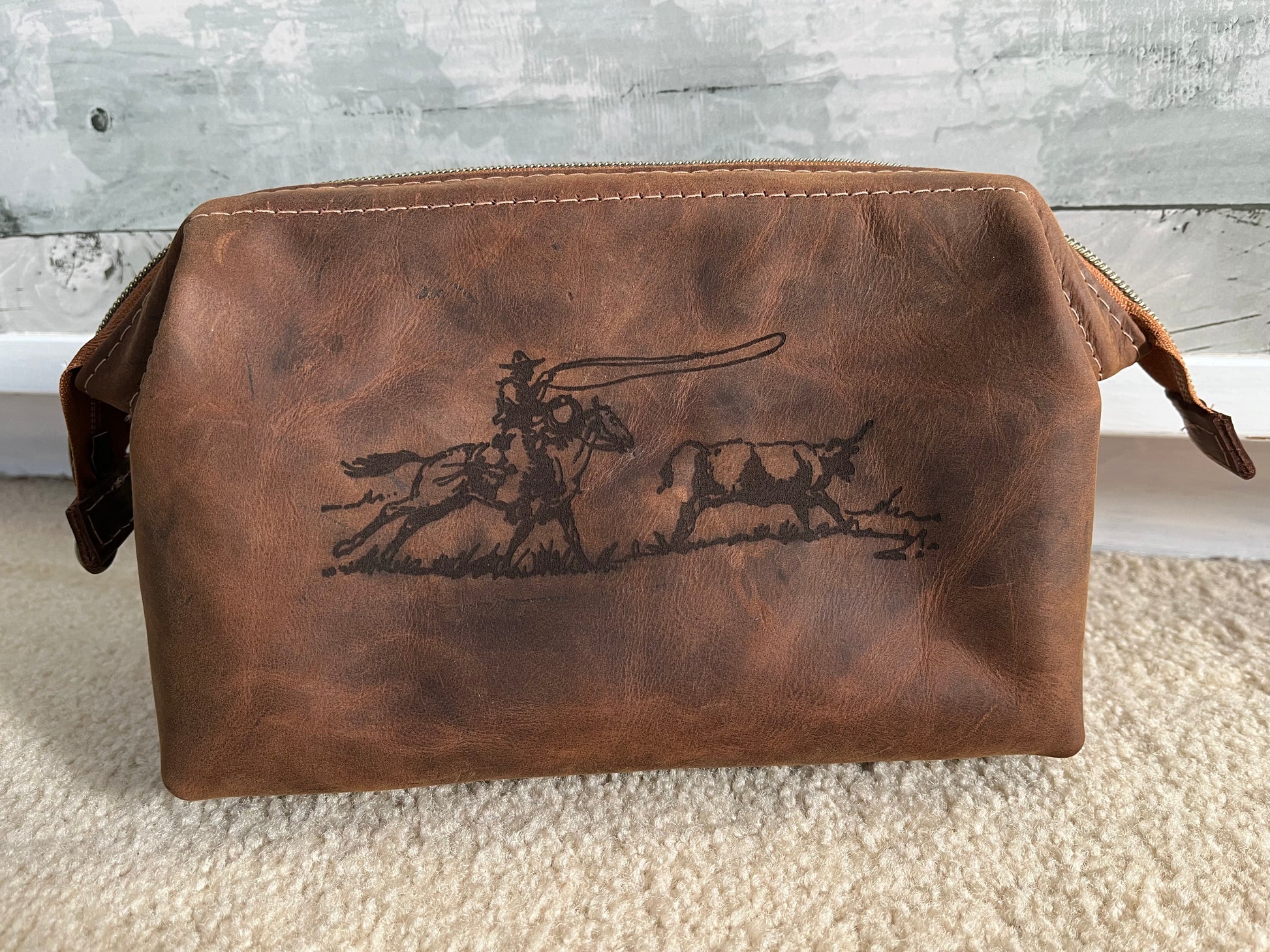 Beautiful, distressed leather toiletry bag with the image of a cowboy roping a calf embossed on the front panel. Bag is lined with waterproof canvas, so is easy to turn out and wipe clean.  Held open with an internal metal frame.  Bag measures 8.5"L x 5H" x 4"D