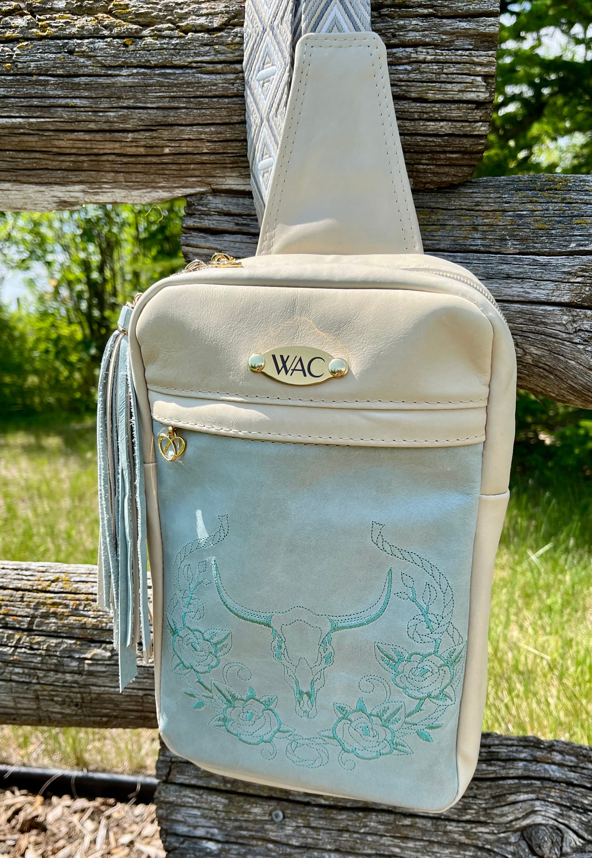 Buttery soft and supple teal and cream leathers with matching longhorn and roses teal embroidery. Zippered pocket on the front.  Matching teal zipper pull tassel. Gold hardware and zippers.  Inside there is a leather topped slip pocket.  Sling can be worn on the front or back, left or right hand side of the body. Measures 11Hx7Wx3D.