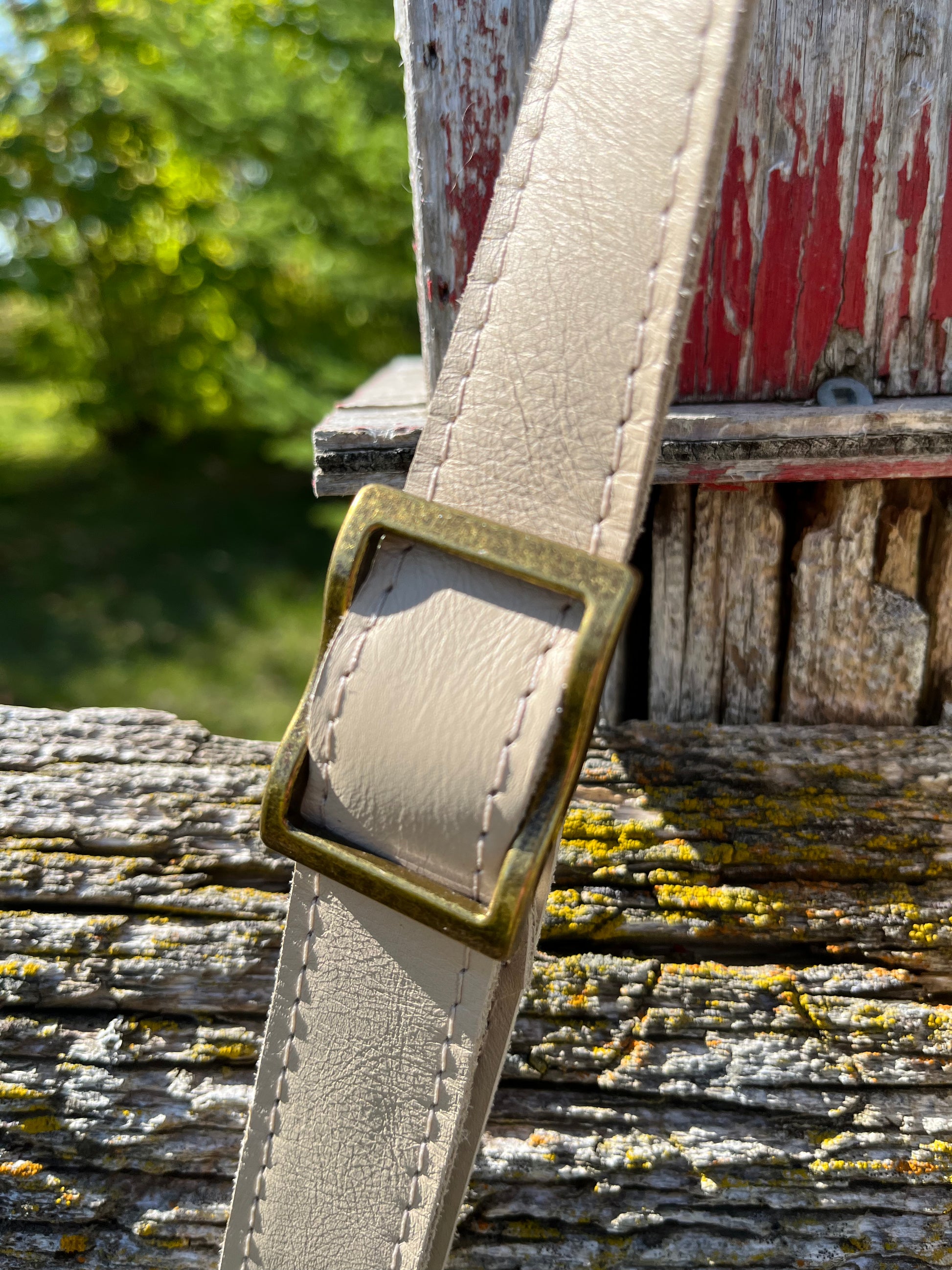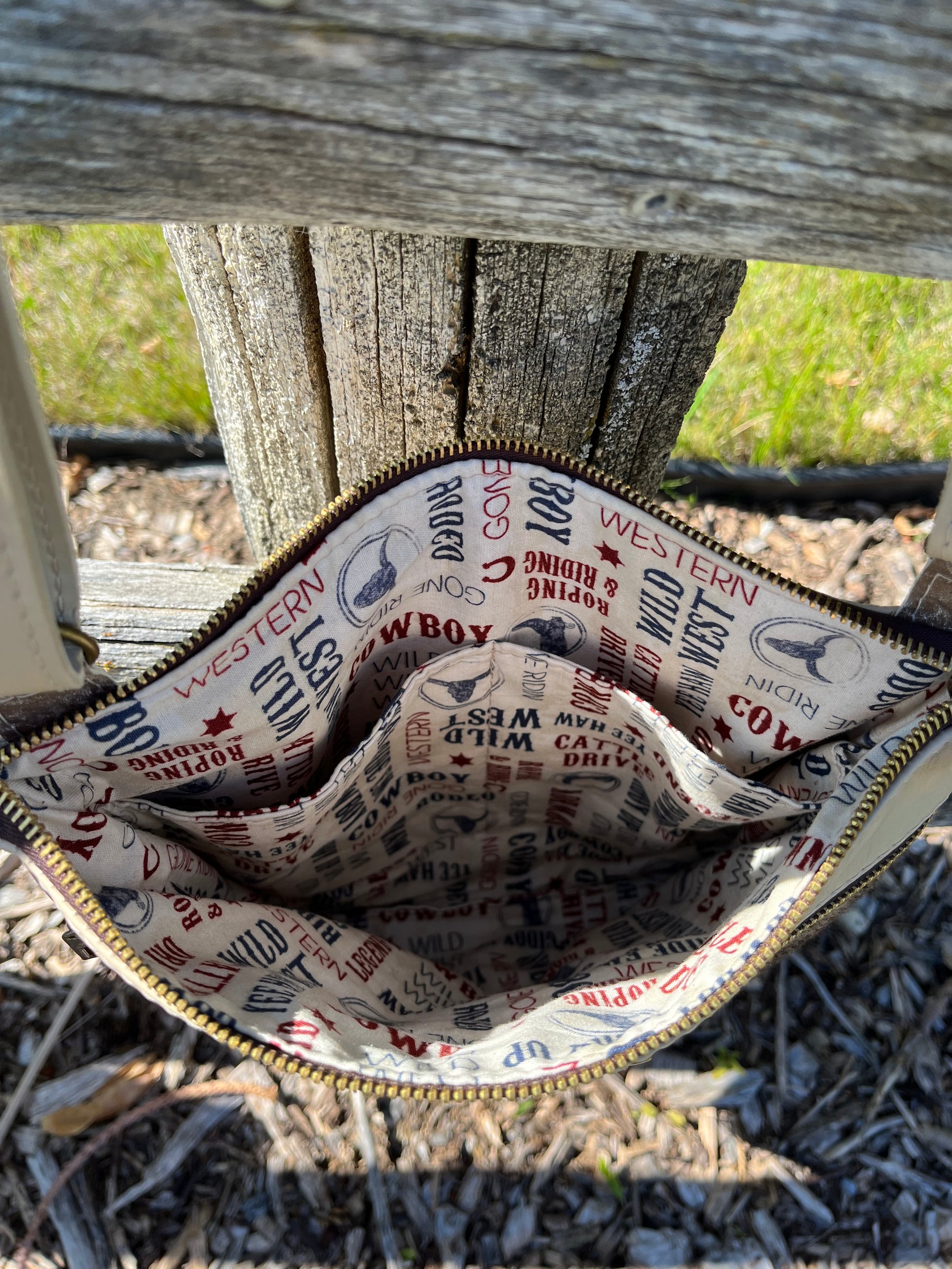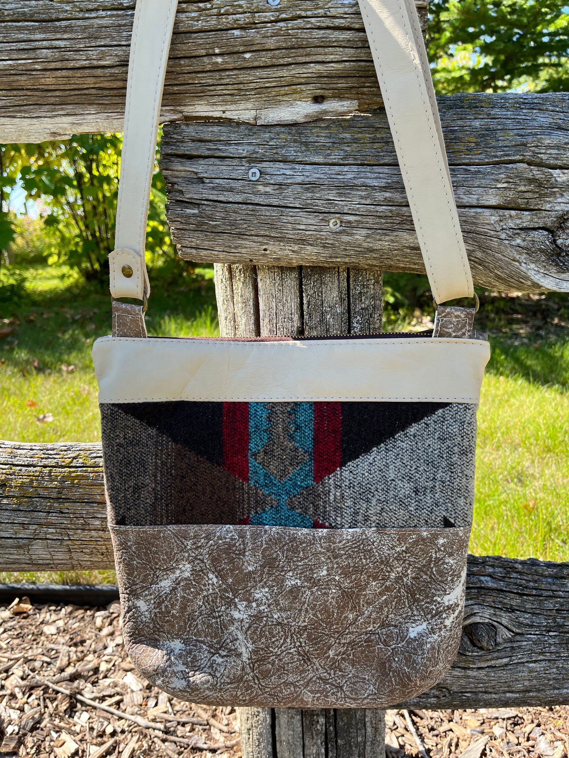 Each purse I make from this 2 toned mottled beige hide will be truly unique. Each piece is different as the marbling on this hide is never the same in 2 places. I added a middle strip of wool for visual effect and interest. I love the effect it gives. The top strip is a beige leather. High end metal antique brass zippers and hardware. Inside I chose a rodeo inspired cotton. There is a slip pocket on one side of the main body interior. A long slider adjustable crossbody strap to fit any body size. Purse measures 12”Wx12”Hx2”D.