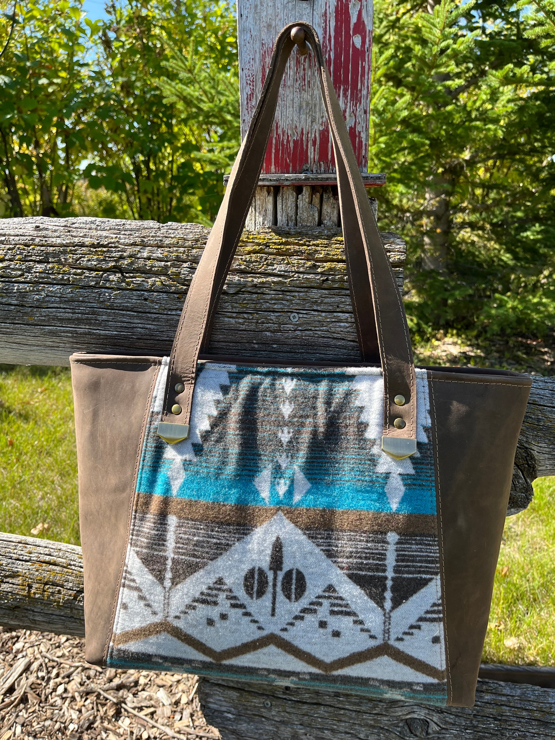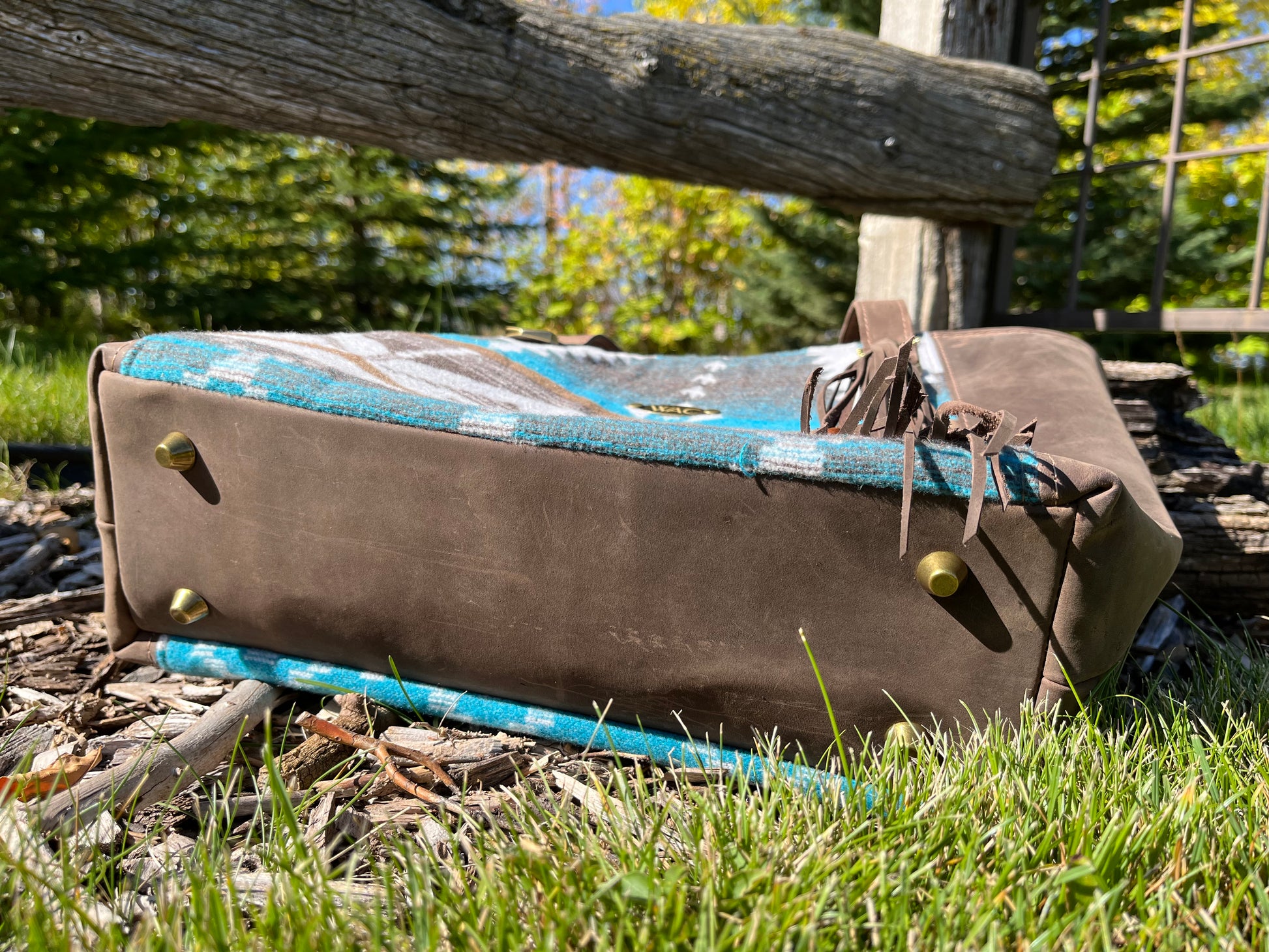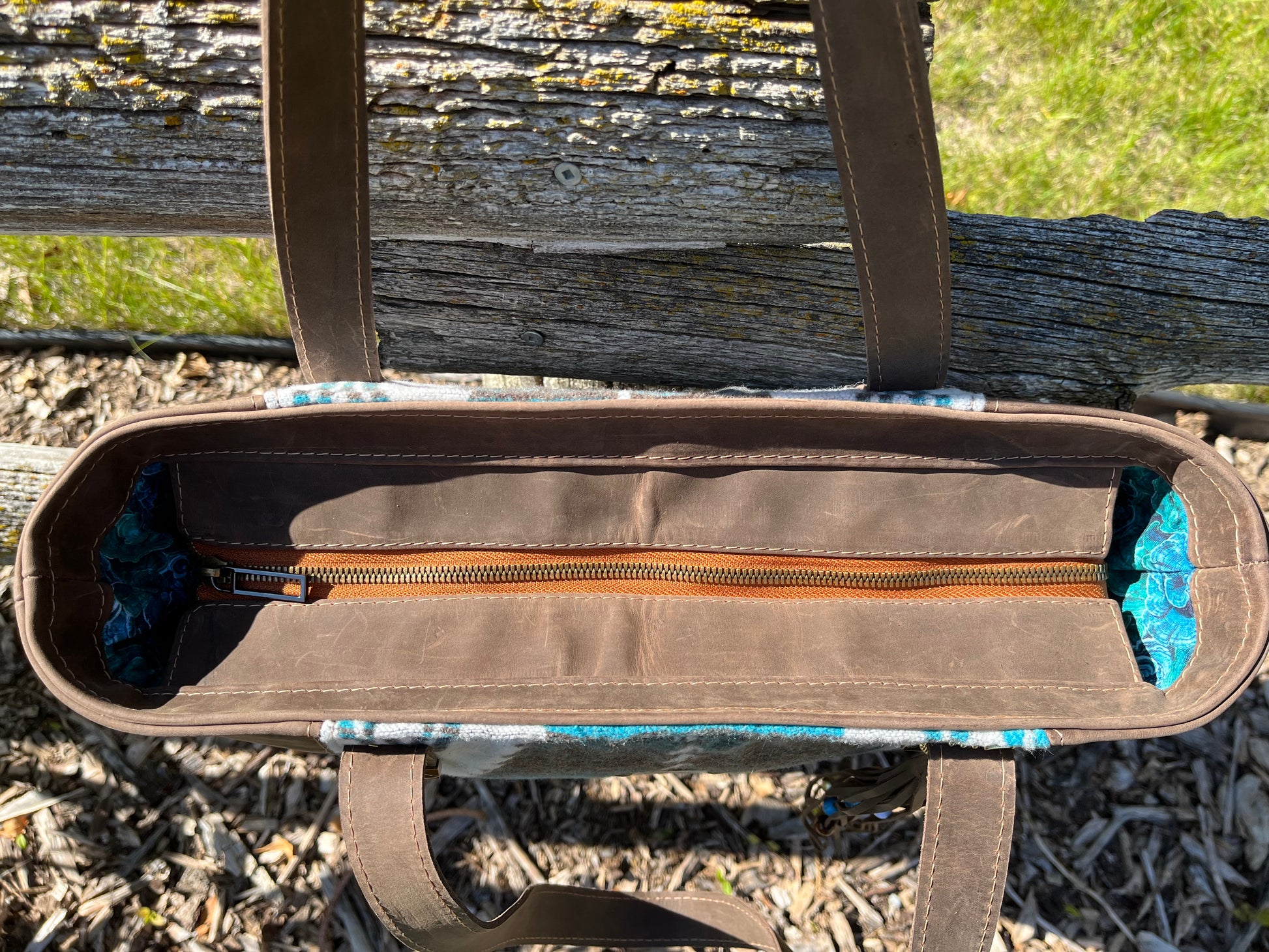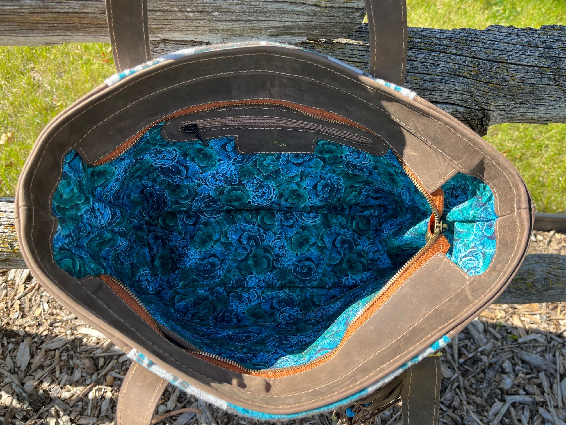 This wool is so beautiful and has so many interesting patterns to feature. For this tote, I decided to focus on the “mountains” in the pattern. I’ve paired the wool with a very popular distressed brown leather. Antique brass zippers and hardware in keeping with the rustic theme.I’ve added a beaded matching tassel. Inside I chose a bold teal blue floral pattern to coordinate with the exterior teal. A leather overlay zipper pocket on one side and a dual slip pocket with a pen slot on the other side. Purse feet on the exterior base to keep it clean and classy. This tote will fit most laptops. Measures 18” W at top x 13” W at bottom x 12” H x 4.25” D.